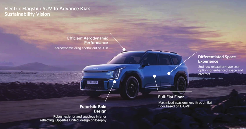 EV9 can travel up to 497 km on a single charge, with maximum power output of 385 PS for the AWD model equipped with 21 inch tires. *The driving range and performance figures are based on the WLTP.